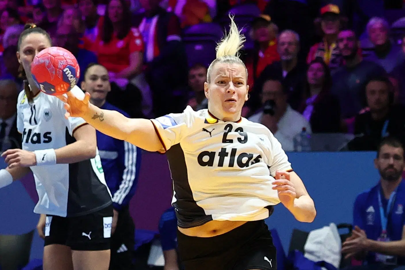 Í Ahoy høllini í Rotterdam vann Týskland í HM-hálvfinaluni ein greiðan 29-23 sigur á verandi fronsku meistarunum, og favorittunum. Í steðginum vóru tær týsku á odda 15-12.