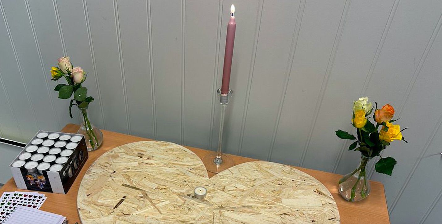 Ein lokalur træskerari hevur í nátt skorið træhjartað, sum sæst á myndini omanfyri, so fólk, sum í dag hava verið til minningarløtu fyri gentuni, hava havt møguleikan at skriva eina heilsu á hjartað.