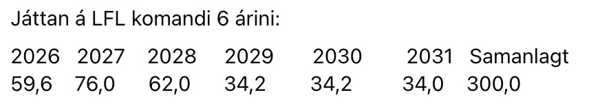 Játtaðar eru 76 mió í 2027, og 62 mió í 2028 til kalsoyarferju (LFL s. 108). Hesar verða fluttar í tunnilin. Írestandi upphæddin verður fíggjað frá 2029 til 2031. Sí talvu niðanfyri:
