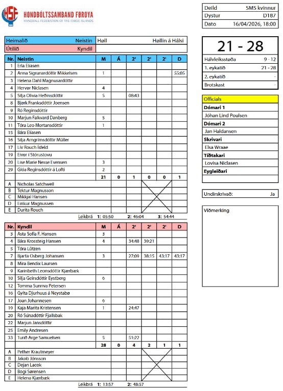 HER ber til frá HSF at síggja dómaraseðilin frá dystinum Neistin-Kyndil 21-28 (9-12):
