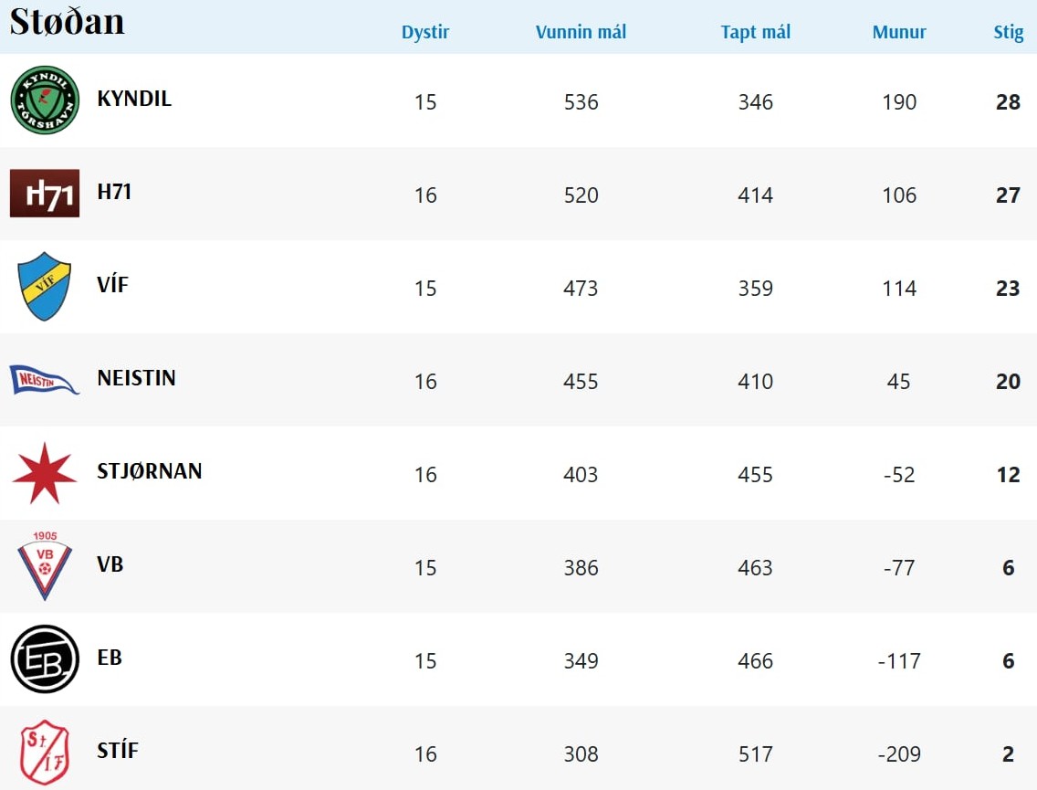 HER ber til frá HSF at síggja dómaraseðilin frá dystinum millum VB og Kyndil, umframt støðuna í deildini: