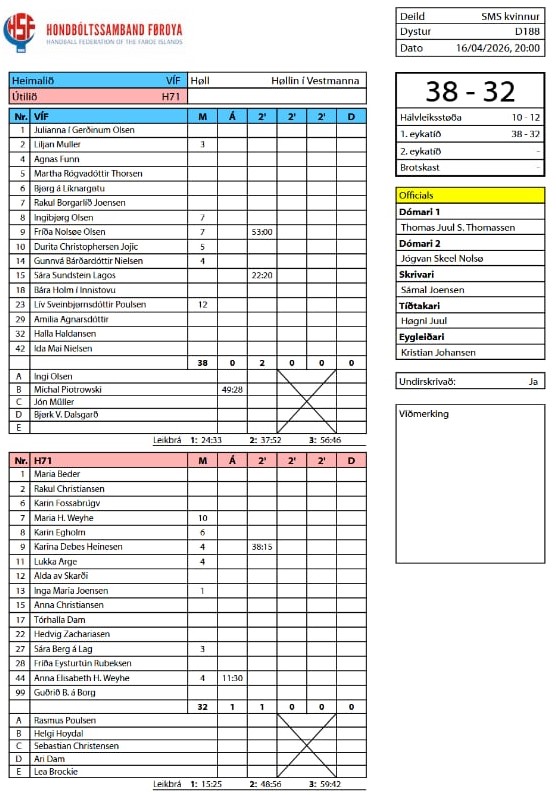 HER ber til frá HSF at síggja dómaraseðilin frá 1. FM-hálvfinaluni VÍF-H71 38-32 (29-29 - 10-12):